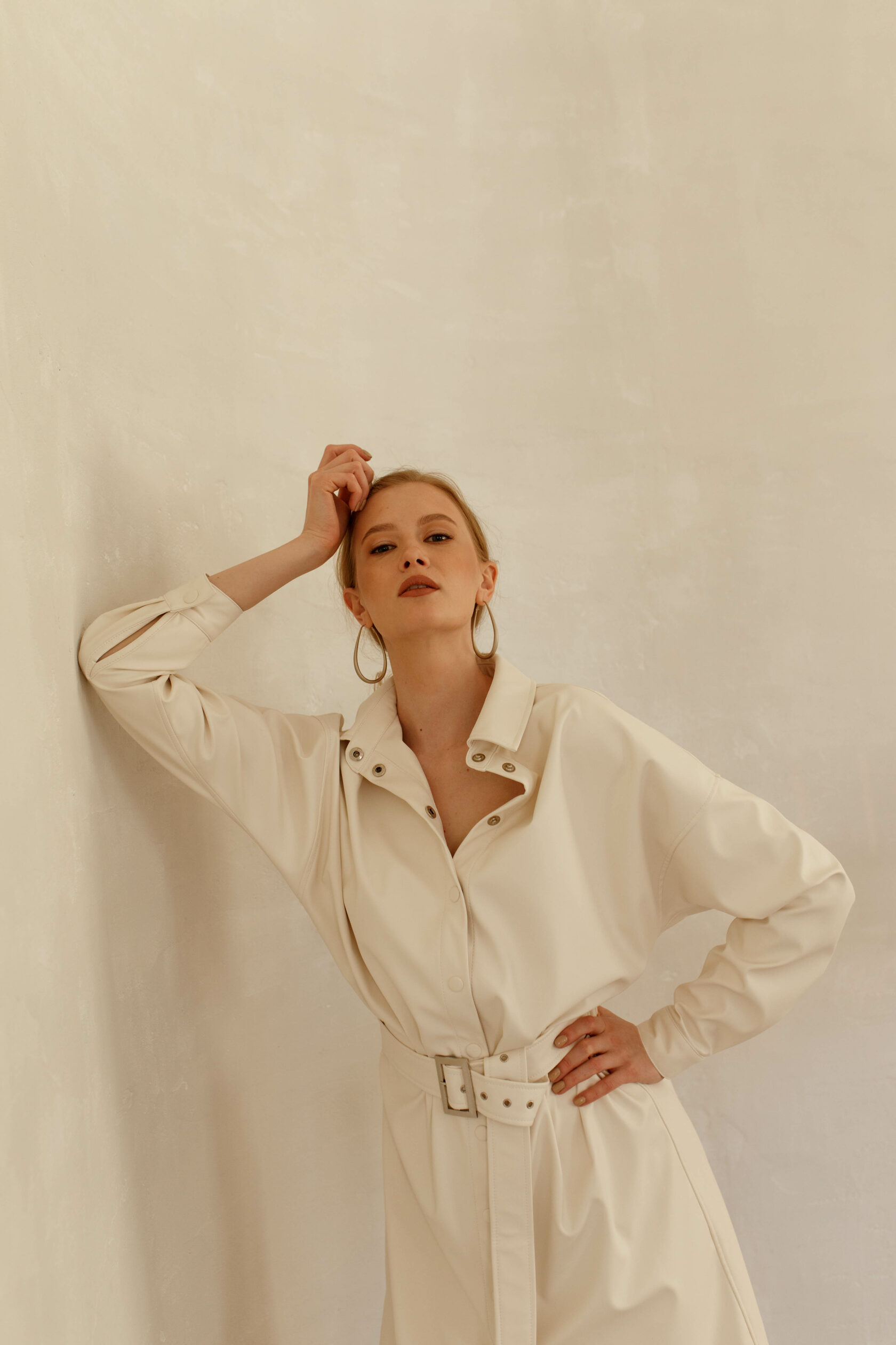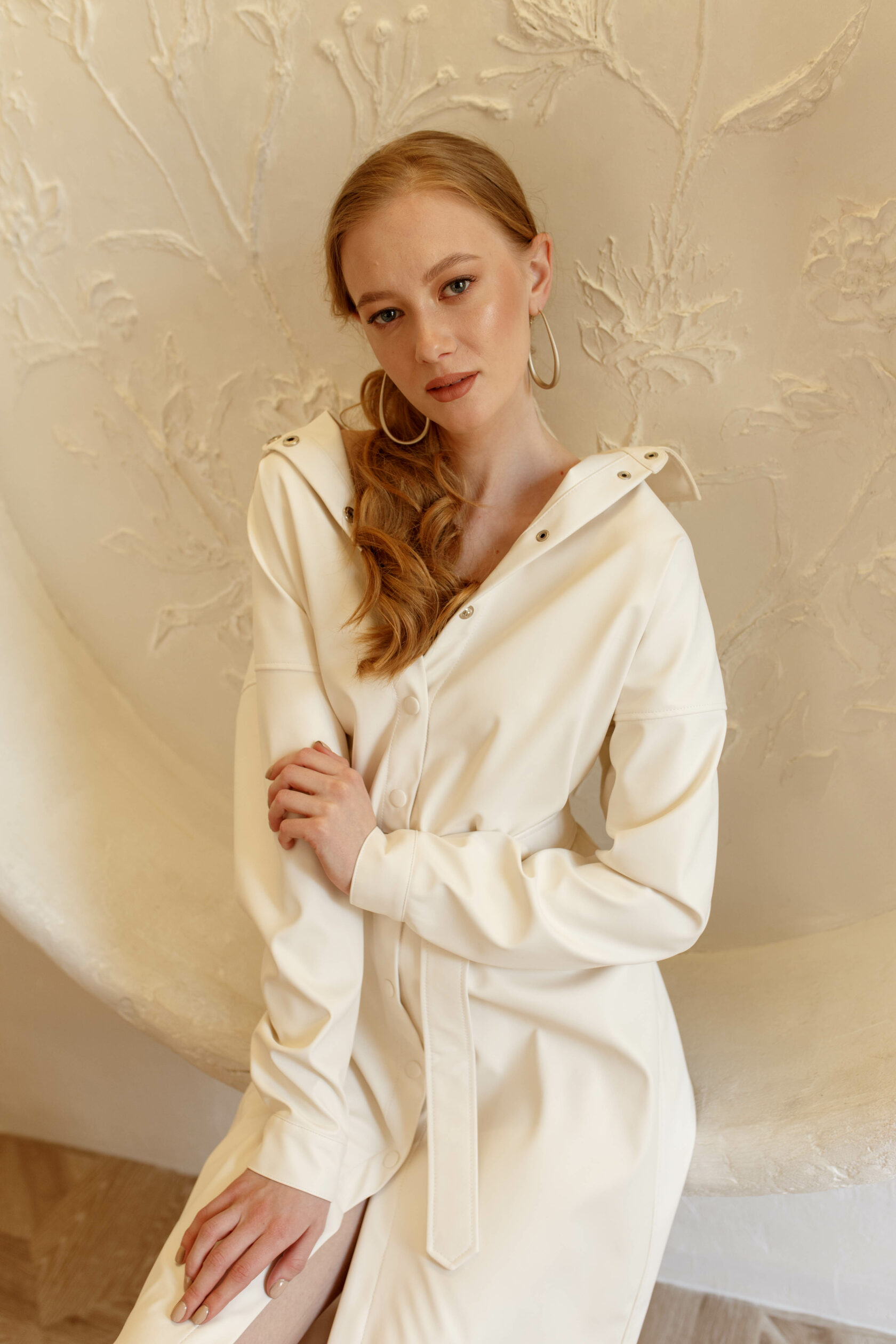 Кожаное платье-рубашка длины миди - модный must have сезона для уверенных в себе девушек. Модель рубашечного кроя на кнопках, в тон основного цвета. Широкий пояс эффектно подчеркивает талию.